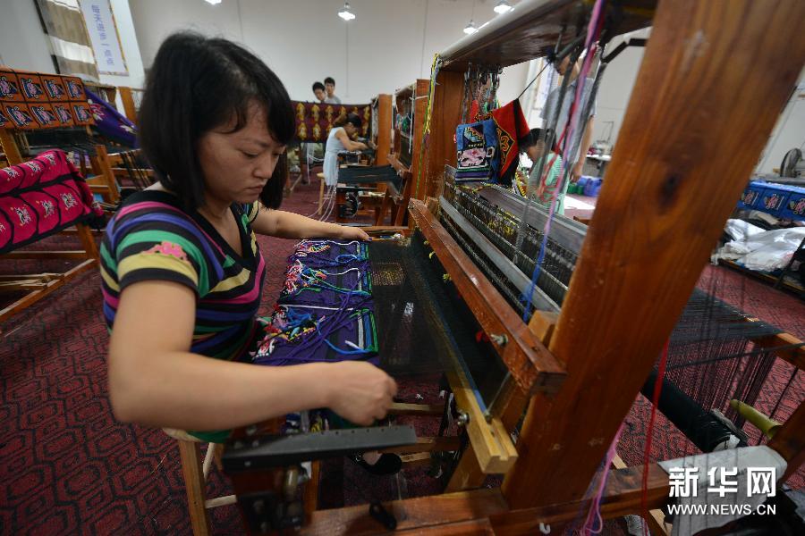 A worker weaves Xilankapu, a Tujia brocade, at a brocade company in Enshi Tu and Miao Autonomous Prefecture, central China's Hubei Province, June 2, 2015. (Photo/ Xinhua)