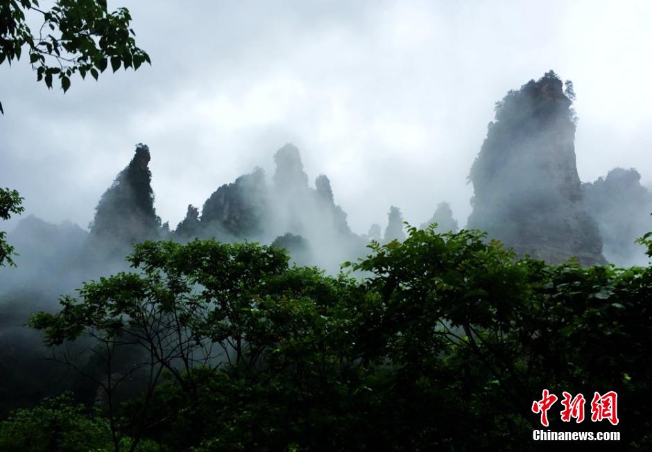 On June 2, Wulingyuan Scenic Area in world natural heritage site Zhangjiajie is caught in pouring rain. Mountains shrouded in mist attracted large numbers of tourists. (Chinanews.com/Wu Youngbing)