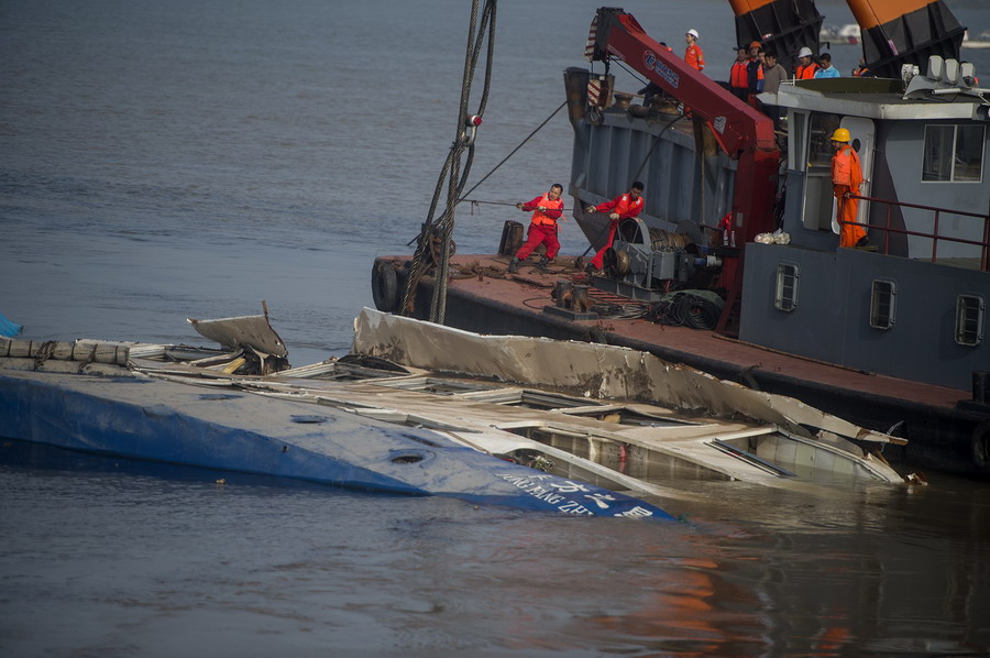 Rescue team turns capsized cruise ship 90 degrees onto its side. (Photo/ Xinhua)
