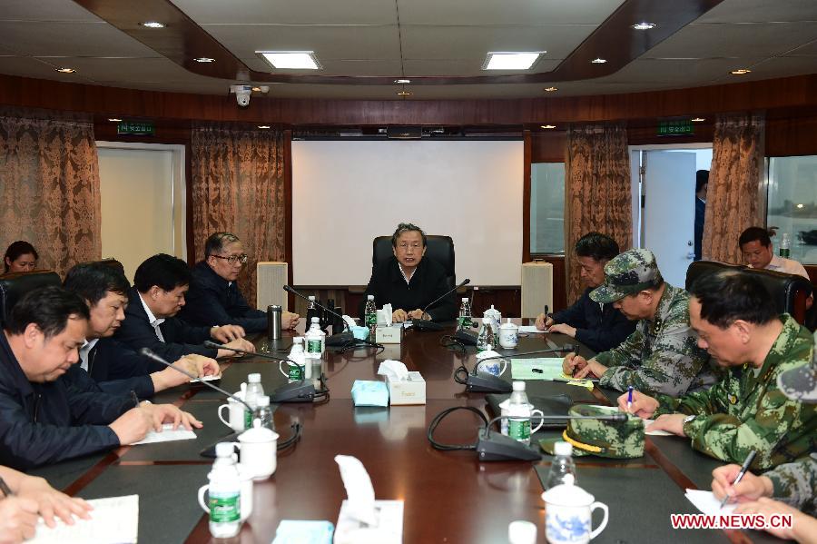 | Chinese Vice Premier Ma Kai (C) presides over a meeting on search and rescue work of the cruise ship Eastern Star that capsized late on Monday in the Jianli section of the Yangtze River in central China's Hubei Province, June 5, 2015. (Xinhua/Hao Tongqian) |