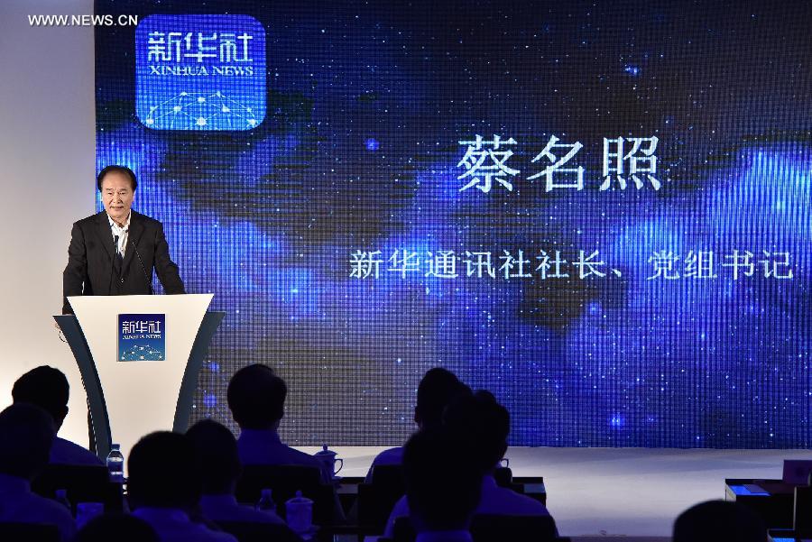 President of Xinhua News Agency Cai Mingzhao addresses the launch ceremony of a new version of Xinhua's mobile news app in Beijing, capital of China, June 8, 2015. Xinhua News Agency launched on Monday a new version of its Chinese news app, marking a key step in the news agency's efforts to advance the integration between traditional and new media. (Xinhua/Li He)