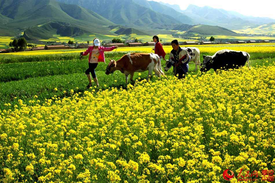 Picturesque scenery of rape flowers in Menyuan Hui Autonomous County, northwest China's Qinghai Province. More than 500,000 mu (about 33,000 hectares) of rape flowers attract many tourists here. (Photp/people.cn)