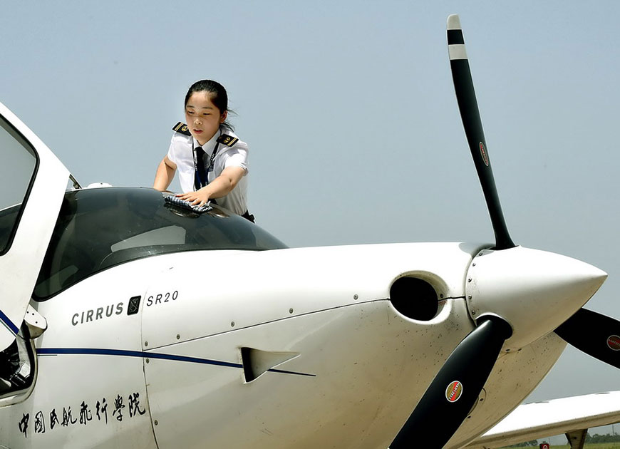Geng Chen cleans the cabin window before the flight training. (Xinhua/Wang Song)