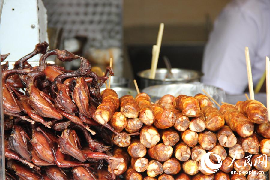 Photo shows a variety of local snacks sold in Jinli Pedestrian Street. Jinli Pedestrian Street is one of the oldest and busiest streets in Chengdu, southwest China’s Sichuan province. You can get a taste of authentic Chengdu flavor by trying local snacks and specialties.(People's Daily Online/Huang Jin)