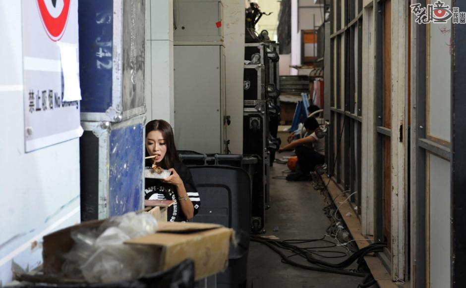 Sun squeezed a little time to eat boxed lunch in the backstage at noon. (Photo/cqnews.net)