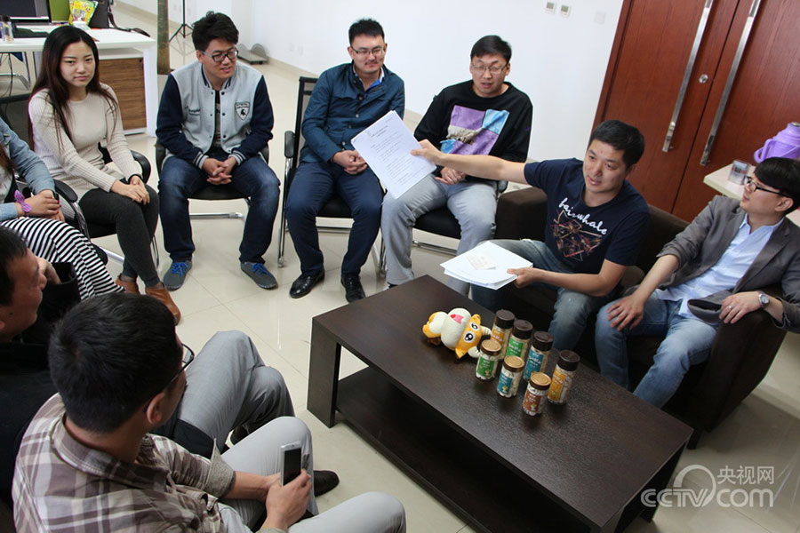 Bai Rui and other staff members have a meeting in his company. (CNTV/Du Xiaojing)