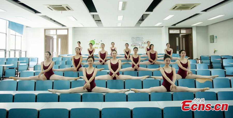 Students majoring in dance show stunts for their graduation photos in Zhejiang Normal University in Jinhua, East China’s Zhejiang province. (Photo provided to China News Service)