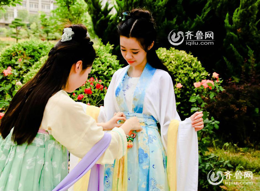 Several students of Shandong Business Institute cerebrate the upcoming Dragon Boat Festival with a Hanfu show. (Photo/ Iqilu.com)