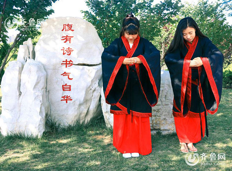 Several students of Shandong Business Institute cerebrate the upcoming Dragon Boat Festival with a Hanfu show. (Photo/ Iqilu.com)