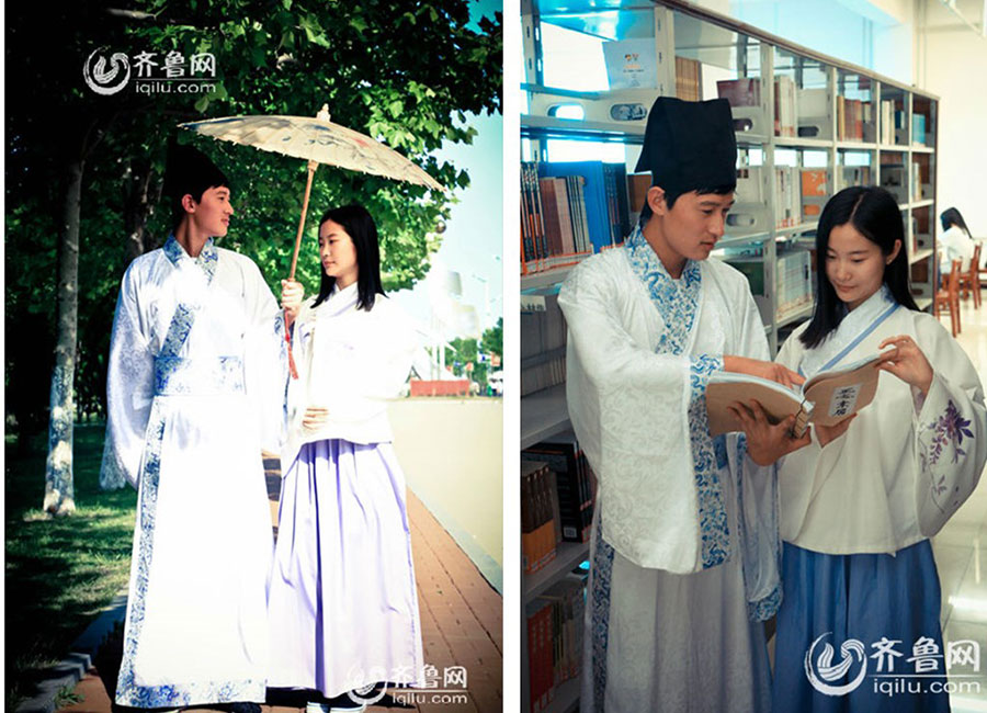 Several students of Shandong Business Institute cerebrate the upcoming Dragon Boat Festival with a Hanfu show. (Photo/ Iqilu.com)