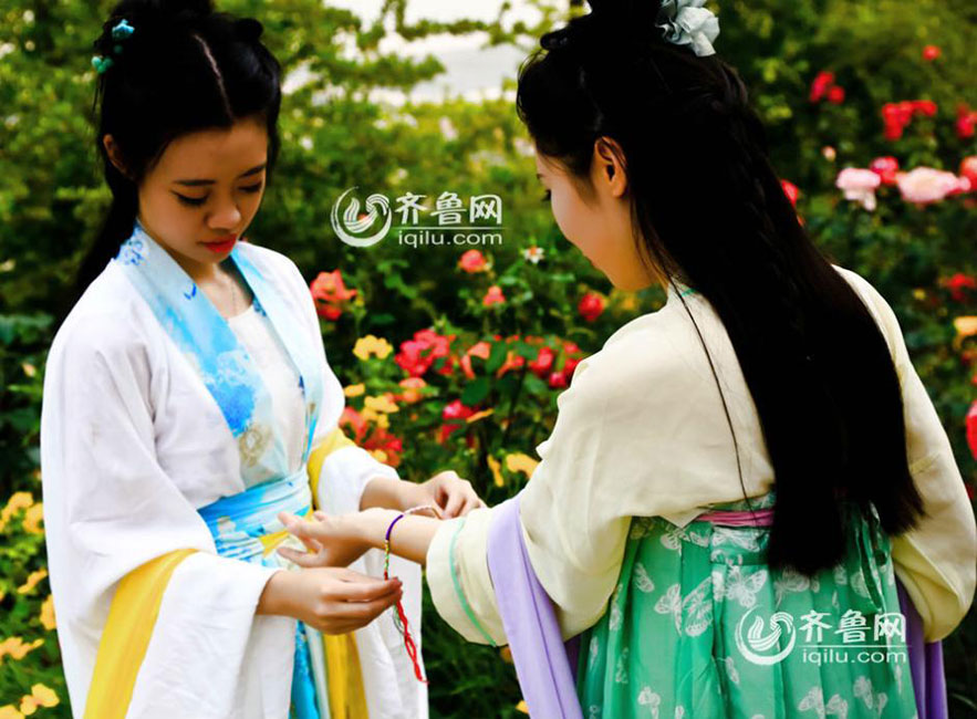 Several students of Shandong Business Institute cerebrate the upcoming Dragon Boat Festival with a Hanfu show. (Photo/ Iqilu.com)