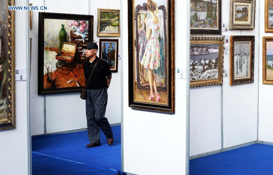 A man enjoys oil paintings during the 2015 China-Russia Cultural Exhibition in Harbin, capital of northeast China's Heilongjiang Province, June 11, 2015. (Xinhua/Wang Kai)