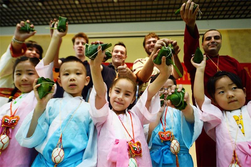 Before the Dragon Boat Festival, foreign families were invited to join with Chinese kids to make zongzi in No.2 Kindergarten under Yangzhou University, east China's Jiangsu Province.(Photo/Xinhua)