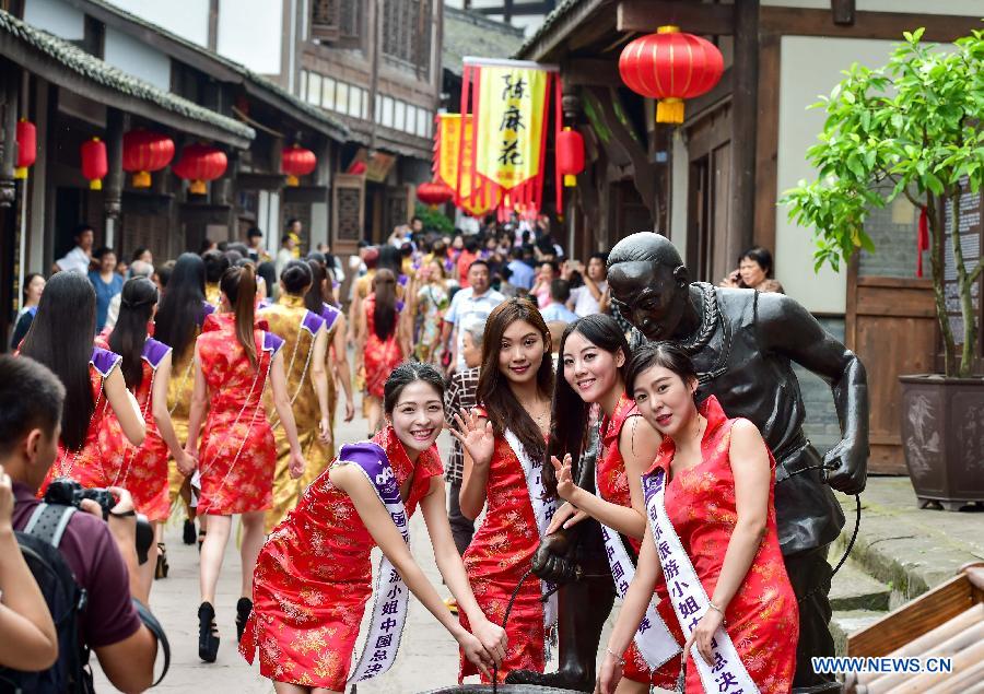 Contestants of the 2015 Miss Tourism Queen International of China division pose for pictures in Anju ancient town of southwest China's Chongqing Municipality, June 12, 2015. More than 50 contestants will compete in a series of individual events which would begin on Friday and China final on June 21 in Anju ancient town. (Xinhua/Liu Chan)