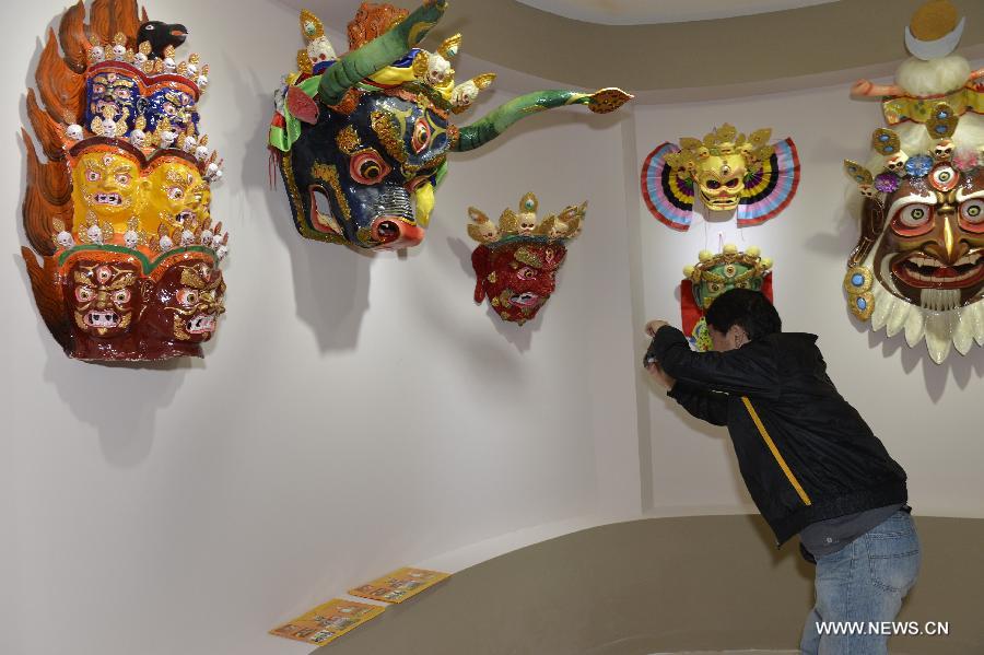 A man views masks at an exhibition of Tibetan intangible cultural heritages in Lhasa, southwest China's Tibet Autonomous Region, June 12, 2015. The second exhibition on the protection of Tibetan intangible cultural heritages was held in Lhasa Friday. (Xinhua/Liu Dongjun)