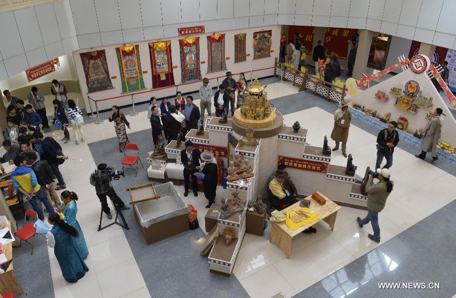 Photo taken on June 12, 2015 shows the scene at an exhibition of Tibetan intangible cultural heritages in Lhasa, southwest China's Tibet Autonomous Region. The second exhibition on the protection of Tibetan intangible cultural heritages was held in Lhasa Friday. (Xinhua/Liu Dongjun)