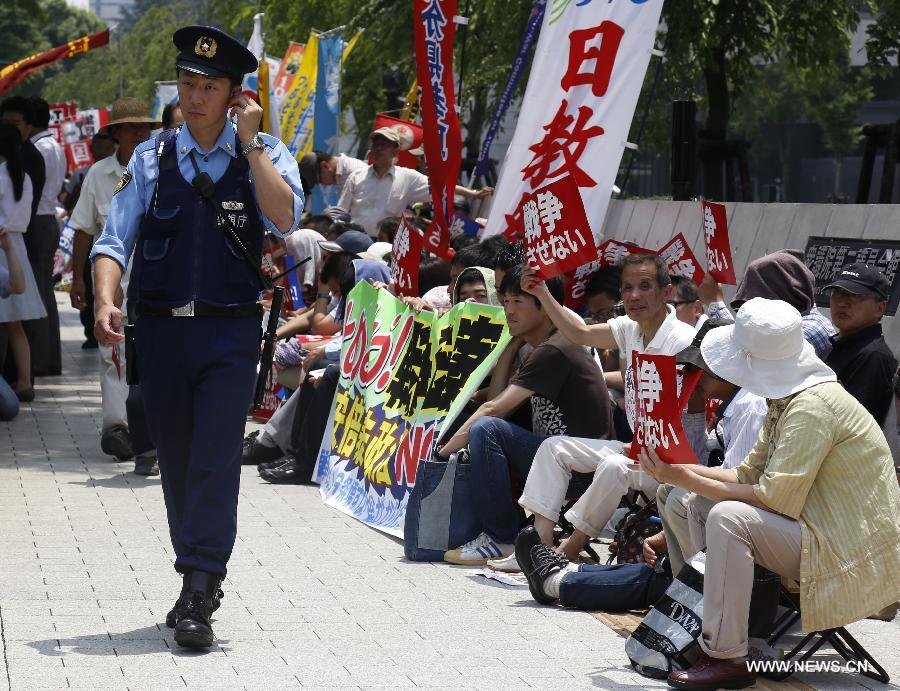 People attend a sit-in protest against the controversial security laws in front of the Diet building in Tokyo, Japan, June 15, 2015. The demonstrators are planning to continue the sit-in protest every weekday until June 24. Hundreds of people participated in the demonstration. (Xinhua/Stringer)