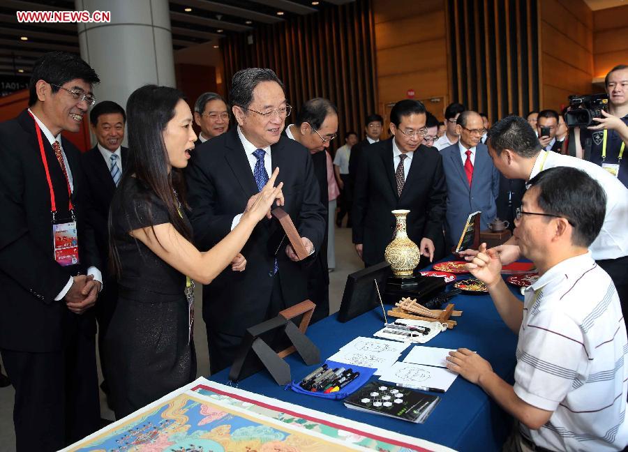 Yu Zhengsheng (3rd L, front), chairman of the National Committee of the Chinese People's Political Consultative Conference, talks with a handicapped at an exhibition before the opening ceremony of the 7th Straits Forum in Xiamen, southeast China's Fujian Province, June 14, 2015. The 7th Straits Forum opened here on Sunday. (Xinhua/Liu Weibing)