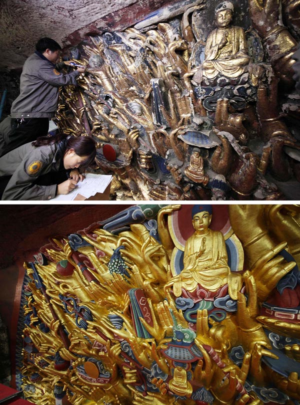 The Thousand-hand Bodhisattva before and after the restoration. (Photo/Xinhua)