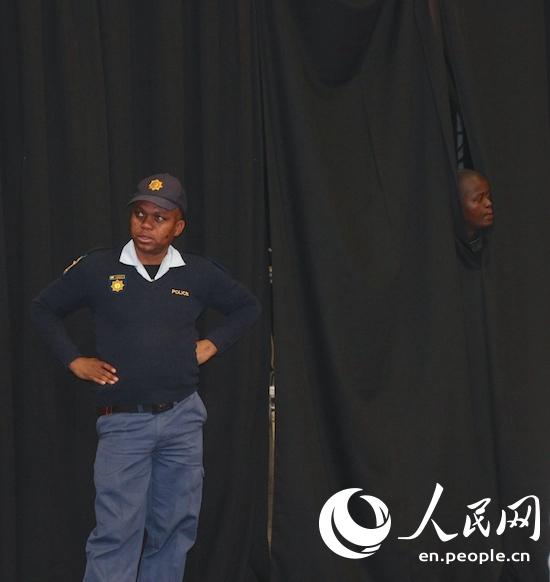 A security guard waits at the scene for the group photo session of presenting heads of African states and government, during the 25th Summit of the African Union in Johannesburg on June 14th, 2015. (People’s Daily Online / Zhang Jiexian)