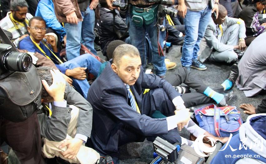 Journalists wait at the scene for the group photo session of presenting heads of African states and government, during the 25th Summit of the African Union in Johannesburg on June 14th, 2015. (People’s Daily Online / Zhang Jiexian)