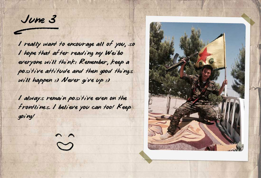 The photos, posted on his Sina Weibo account @LeiG7, show Huang with other volunteers from around the world serving in the YPG, a Kurdish militia that provides security in most of Syria’s Kurdish areas.