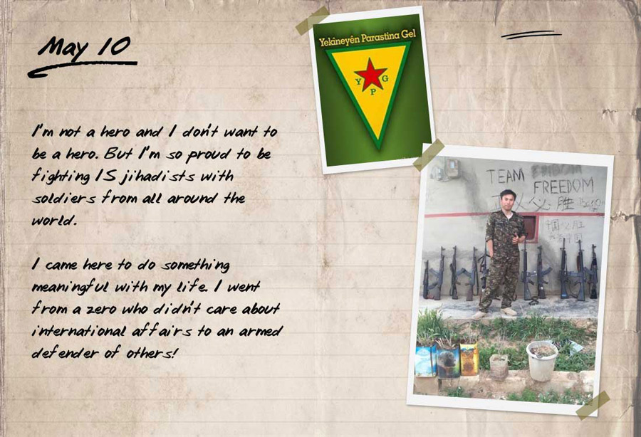 Huang Lei, 23, is one of hundreds of international fighters helping Kurdish forces engage the Islamic State in Iraq and al-Sham (ISIS) in northern Syria, near the border of Turkey.