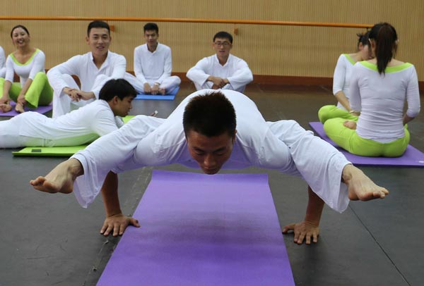 Students do yoga in Yunnan University of Nationalities in Kunming. The university established the country's first yoga college on Saturday and the college will start enrolling students in August. Provided to China Daily