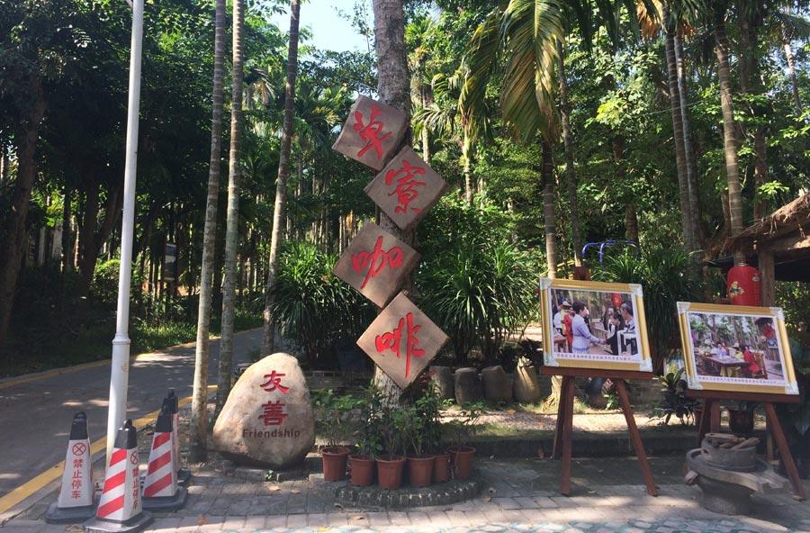The photographs of Peng Liyuan visiting Beireng village are displayed in front of the Coffee Hut, June 10, 2015. (Photo: China Daily/Huang Yiming)