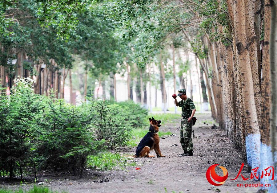 On June 10 a soldier trains his police dog. (Photo/ Xinhua)
