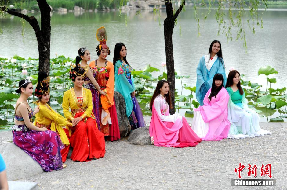 College students take graduation photos in costumes of Han and Tang Dynasties at Tang Paradise in Xi'an, capital of northwest China's Shaanxi province, June 14, 2015. (CNS/Zhang Yuan)