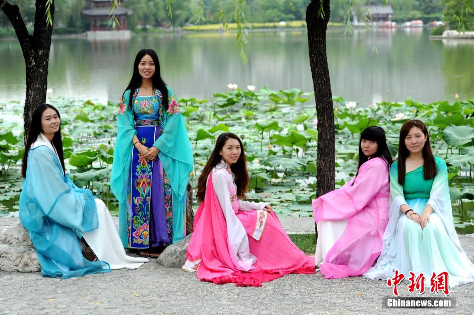 College students take graduation photos in costumes of Han and Tang Dynasties at Tang Paradise in Xi'an, capital of northwest China's Shaanxi province, June 14, 2015. (CNS/Zhang Yuan)