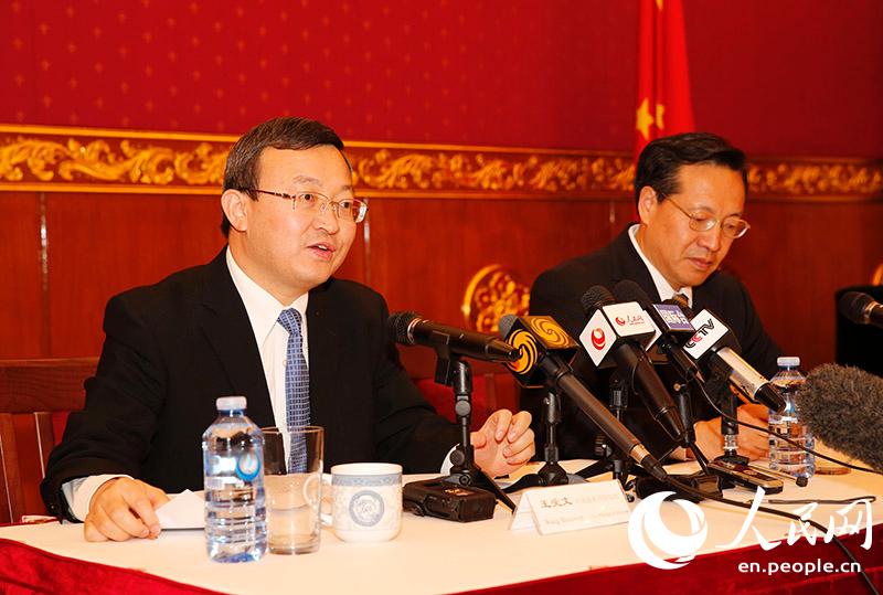 | China's Vice Commerce Minister Wang Shouwen (L) answers questions on the China-Australia Free Trade Agreement in Canberra June 17, 2015. China and Australia signed a long-awaited free trade agreement in Canberra on Wednesday. (People's Daily Online/He Ji) |