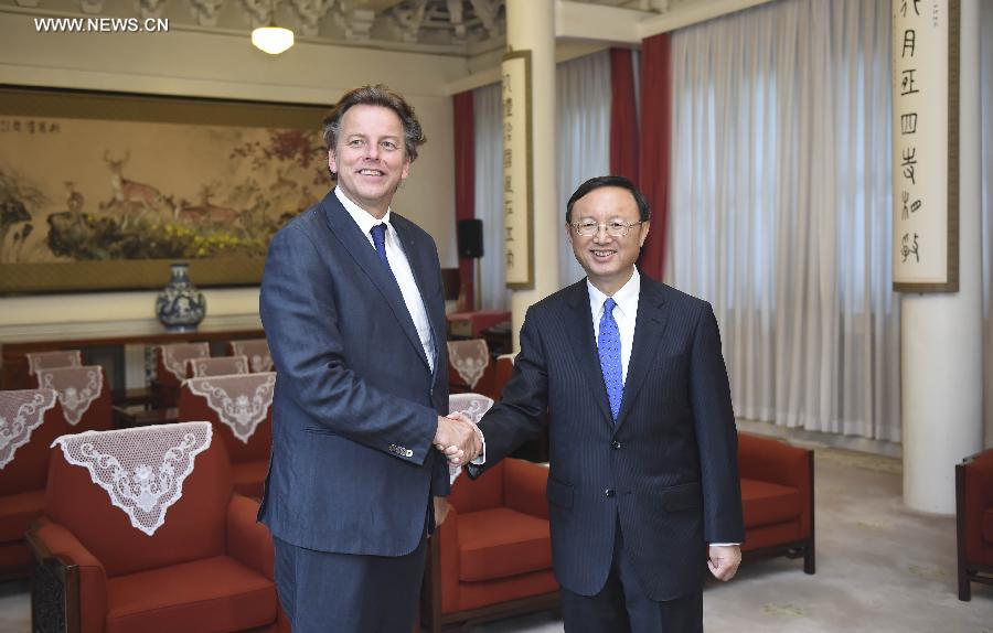 Chinese State Councilor Yang Jiechi (R) meets with Netherlands' Foreign Minister Bert Koenders in Beijing, capital of China, June 18, 2015. (Xinhua/Zhang Duo)