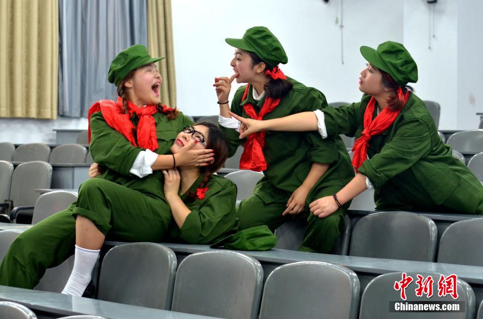 Several senior students wearing safety and industrial costumes take photos in Sichuan Arts and Science University. (CNS/Zhang Ji)