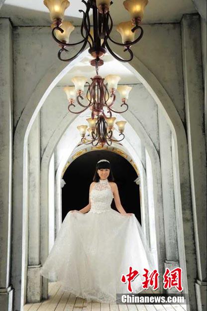 A girl in Northeast Dianli University poses for a photo in wedding dress. (Chinanews.com/Feng Lu)