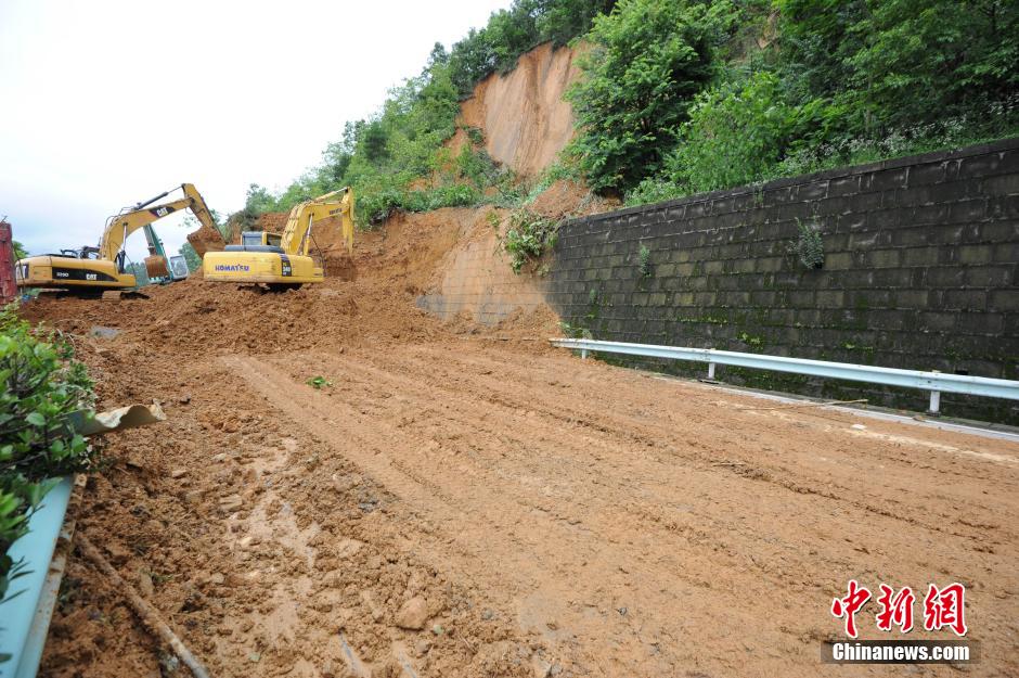 The rain-triggered landslide blocks the road. (CNS/He Junyi)