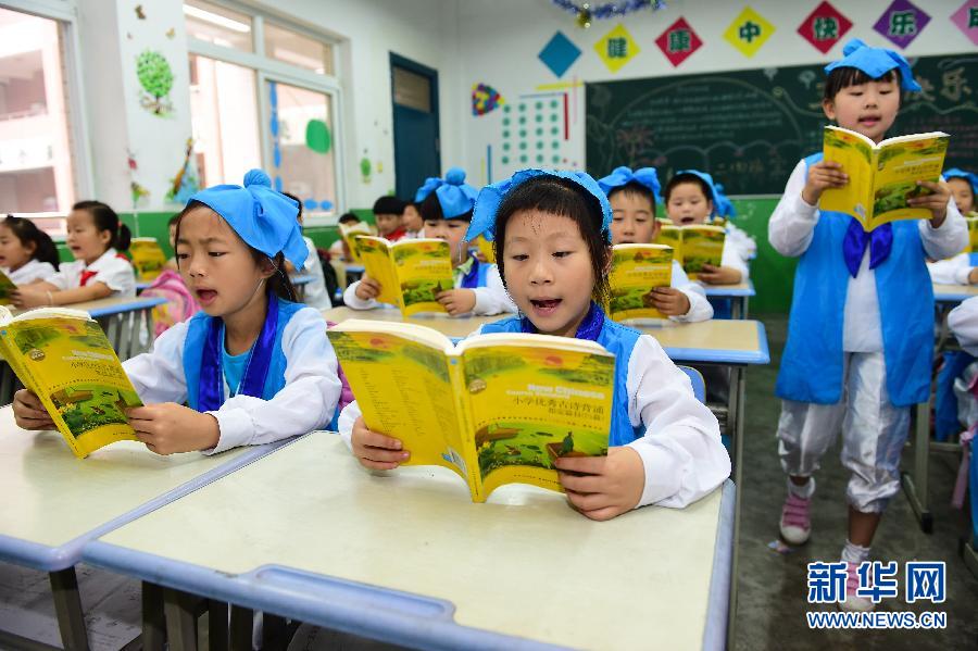 The students in Cuitingyuan Primary School read classic poems in Hebei, east China's Anhui province on Tuesday. Wenboyuan residential community and Cuitingyuan made joint efforts to start a course in reading classics, celebrating the upcoming Dragon Boat Festival.(Photo/Xinhua)