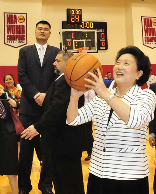 Vice-Premier Liu Yandong shoots for the hoop at NBA basketball team Houston Rockets' home court Toyota Center watched by former Rockets star Yao Ming. A group of Chinese student athletes from Tsinghua High School are working on a basketball training program with the Rockets. Liu will attend the 7th China-US Strategic and Economic Dialogue in Washington on Tuesday. [Photo by Zhang Yongxing / Xinhua]