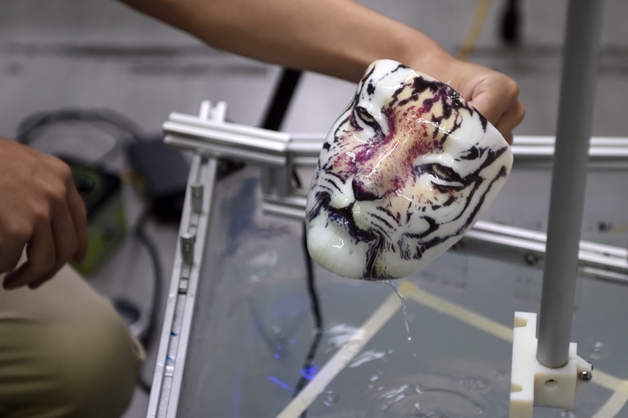 A three-dimensional coloring technology is invented by a research team of Zhejiang University. This technology can solve the problem of coloring three-dimensional objects. (Photo/ Xinhua)
