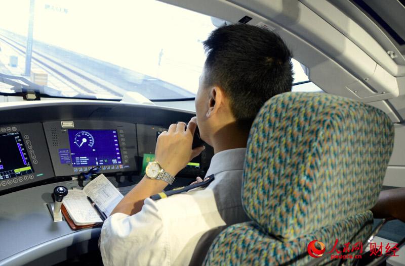 Xu Xiaolin, 37-year-old driver of the train, makes preparation in the cabin. (Photo/People's Daily Online)