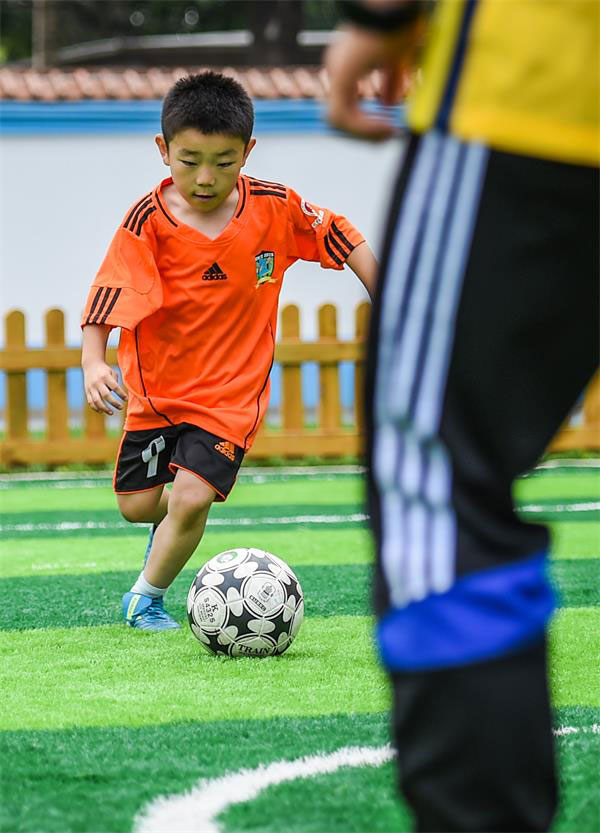 Beijing Liuyi Kindergarten established its first football team made up of young children and built an artificial pitch covering nearly 200 square meters. For each football class, these children undergo serious training on the pitch.(Photo/Xinhua)