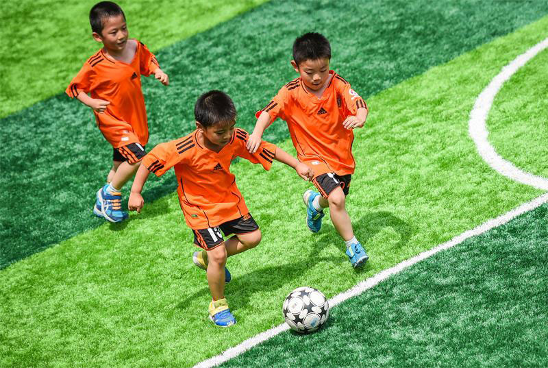 Beijing Liuyi Kindergarten established its first football team made up of young children and built an artificial pitch covering nearly 200 square meters. For each football class, these children undergo serious training on the pitch.(Photo/Xinhua)