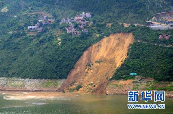 The landslide occurred at 6:40 p.m. on the northern bank of the Daning River, a tributary of the Yangtze River, in Wushan County. Strong waves caused 13 vessels, mostly fishing boats, to sink.