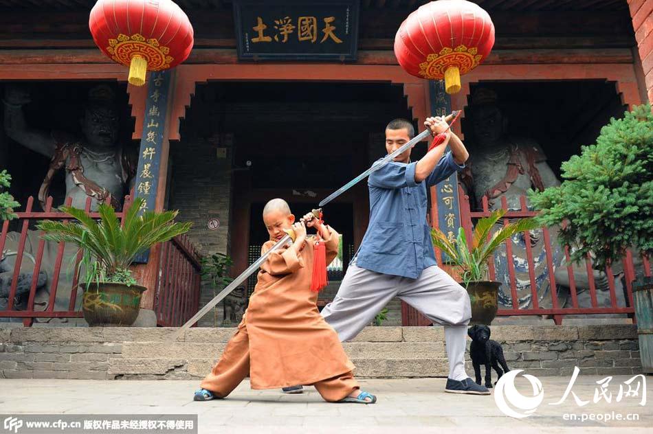 | The cute little "monk" Kele practices sword with his master at Zishou Temple in Lingshi county, north China's Shanxi province. (Photo/CFP) |