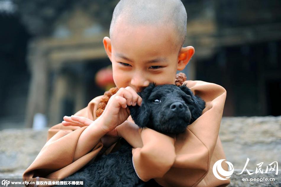 The cute little "monk" Kele holds a black dog in his arms at Zishou Temple in Lingshi county, north China's Shanxi province. (Photo/CFP)