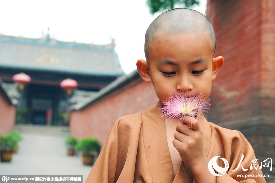 The cute little "monk" Kele smells a flower at Zishou Temple in Lingshi county, north China's Shanxi province. (Photo/CFP)