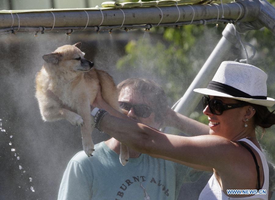 A residents cool her pet dog with a mist spraying facility inside a park in Vancouver, Canada, June 27, 2015. According to the weather forecast from Environment Canada, heat wave warning was issued in Vancouver with temperature expected to rise dramatically over the weekend with about 30 degree Celsius. The inland of British Columbia may hit at 40 degree.(Xinhua/Liang sen)