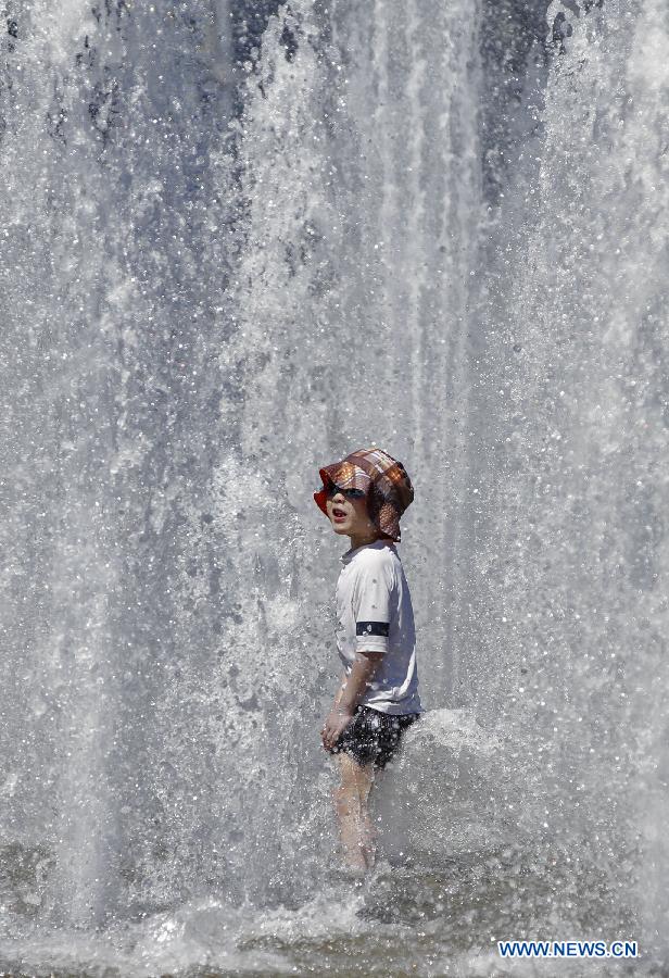 A child enjoys a fountain at a park in Vancouver, Canada, June 27, 2015. According to the weather forecast from Environment Canada, heat wave warning was issued in Vancouver with temperature expected to rise dramatically over the weekend with about 30 degree Celsius. The inland of British Columbia may hit at 40 degree.(Xinhua/Liang sen)