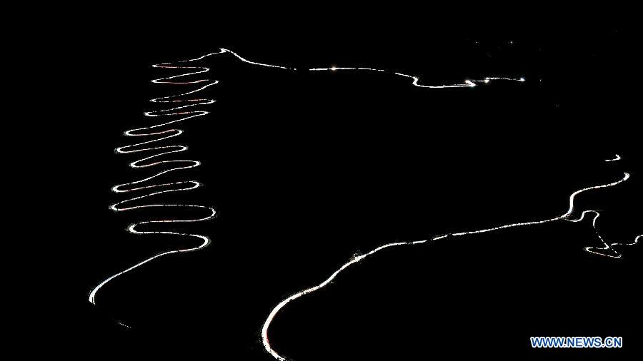 | This long exposure photo taken by cellphone on June 24, 2015 shows luminous trails of car headlights winding through a mountainous zigzag in Qinglong County, China's southwest Guizhou Province. The mountainous zigzag, also called 24-zig, which is a section of the famous Stilwell Road, witnessed more than 2000 trucks fully loaded with military supplies passed by daily in World War II. The winding mountain road was finished on 1935. In 1942, U.S. engineering corps renovated it into a part of the Yunnan-Guizhou highway, a section of the Ledo Road, or the Stilwell Road. In the war time, 15000 tons of strategic materials were delivered on the 24-zig every month. Those goods were sent from Ledo of India, via Kunming of China's Yunnan Province and finally arrived in Chongqing, the War Capital of the then Chinese government. The 24-zig is acknowledged as "the lifeline of the Resistance War against Japanese". (Xinhua/Liu Chan) |